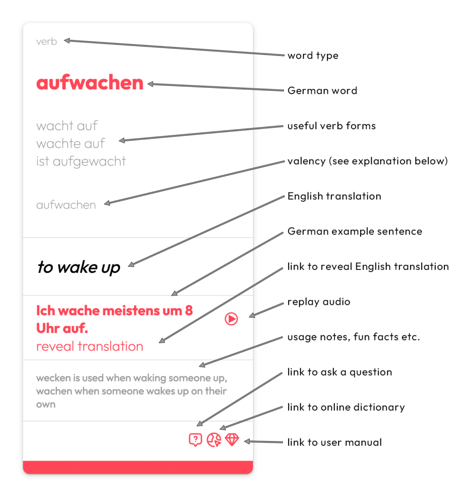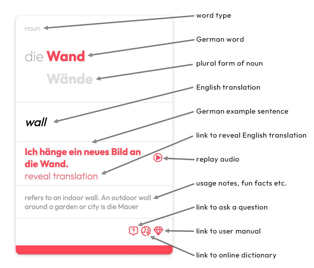 Since I’ve only included one example sentence for each word to keep it simple, it is sometimes the case that one of the translated meanings is not reflected in the example sentence context. It is however sometimes the case that one of these additional meanings will occur in another of the example sentences, and if it doesn’t, you will encounter it soon enough in your German input. You can also click on the search icon in the bottom right of each card to look the word up online for additional contexts and examples.